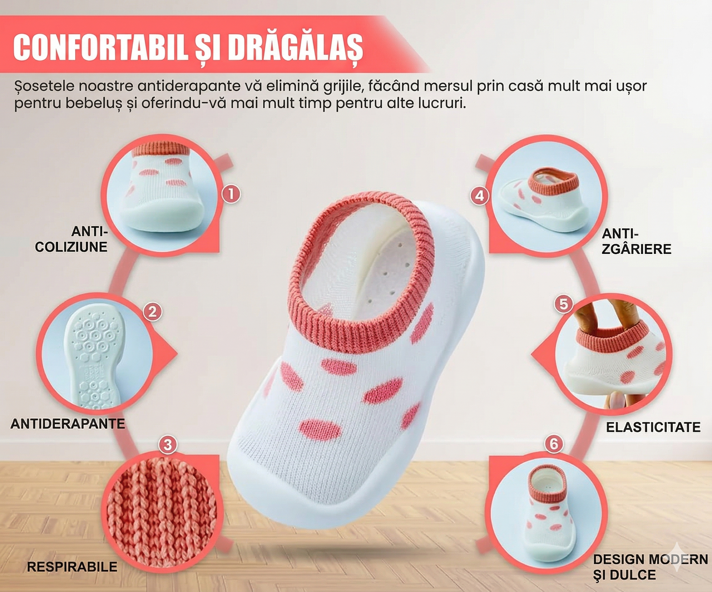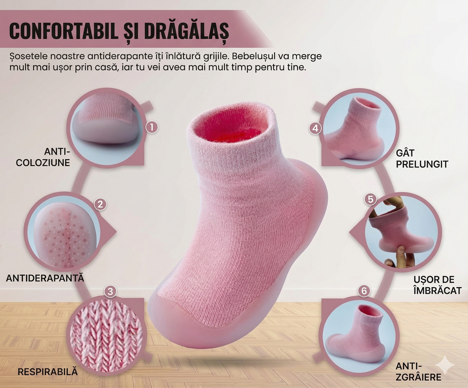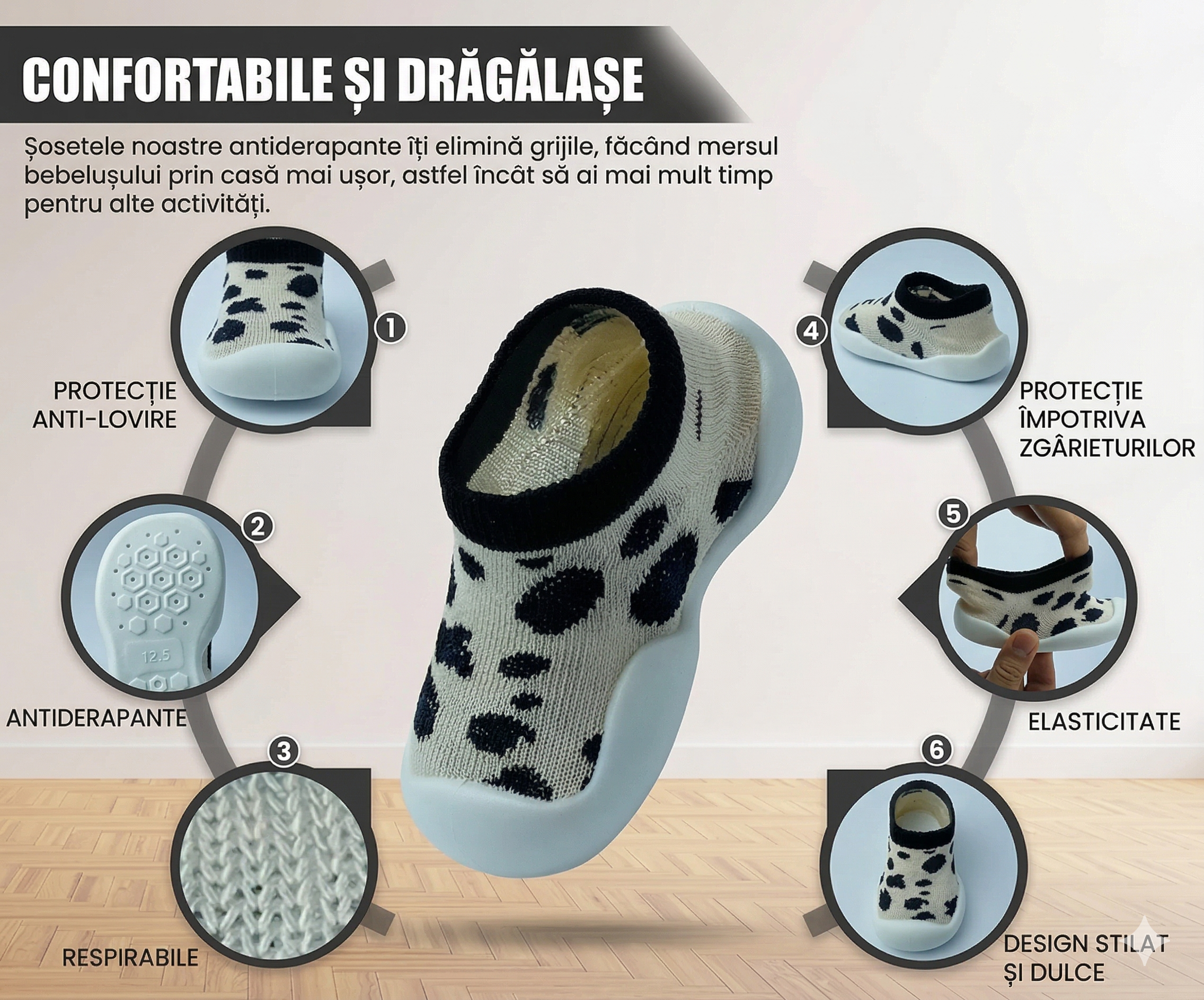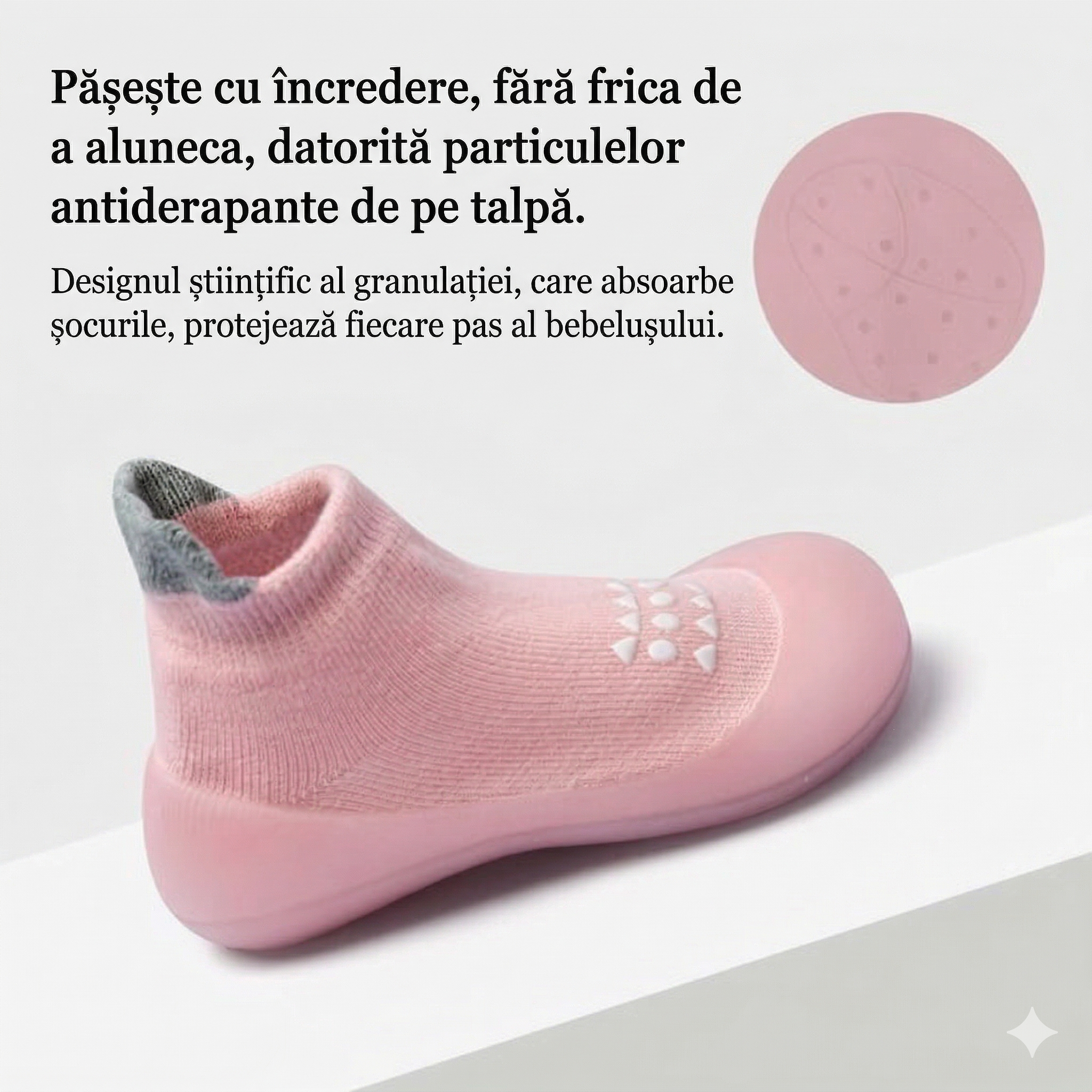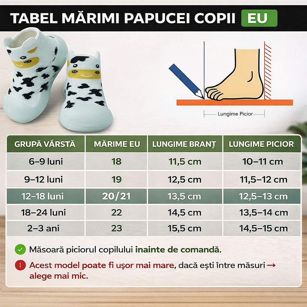 Acești pantofi tip șosetă sunt special concepuți pentru primii pași ai bebelușilor, oferind siguranță, confort și libertate de mișcare. Designul inteligent combină flexibilitatea unei șosete cu protecția unui pantof, fiind alegerea ideală pentru dezvoltarea naturală a piciorului.