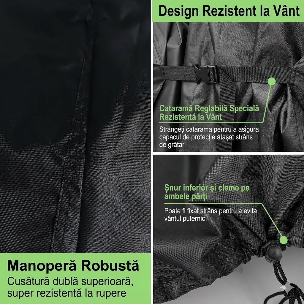 Această husă ajută la prelungirea duratei de viață a grătarului, reducând acumularea de murdărie și necesitatea curățării frecvente.