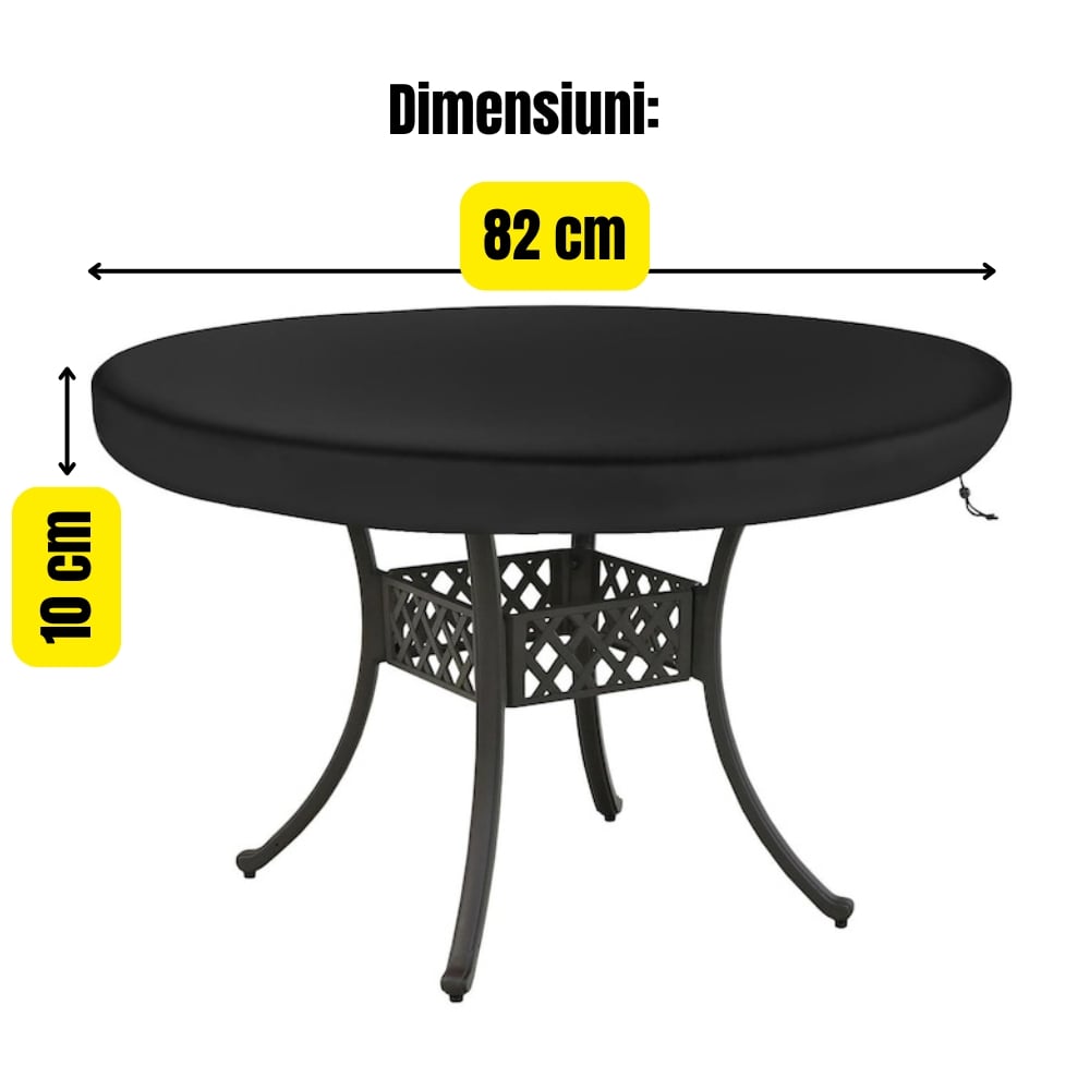 Dimensiuni: Ø 82 cm, înălţime 10 cm – se potriveşte majorităţii meselor rotunde de exterior.