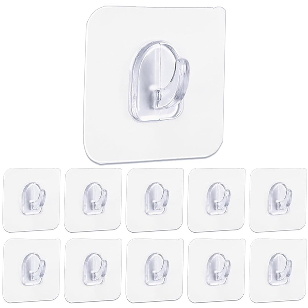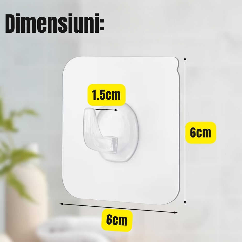 Set 10 cuiere cu adeziv transparent 6x6 cm, fara gauri in pereti, rezistente la umezeala, sustin pana la 5 kg fiecare, ideale pentru baie si bucatarie.