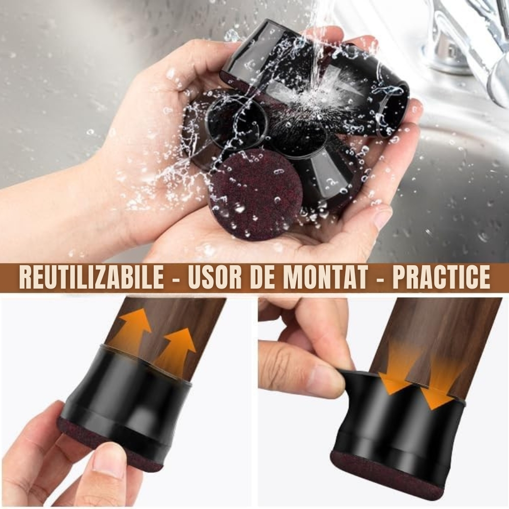 Materialul din silicon elastic se muleaza perfect pe piciorul scaunului, fara adeziv sau unelte, asigurand o fixare ferma si durabila. Partea inferioara este prevazuta cu pasla integrata, care permite alunecarea lina a scaunelor si elimina zgomotele neplacute produse la mutare.