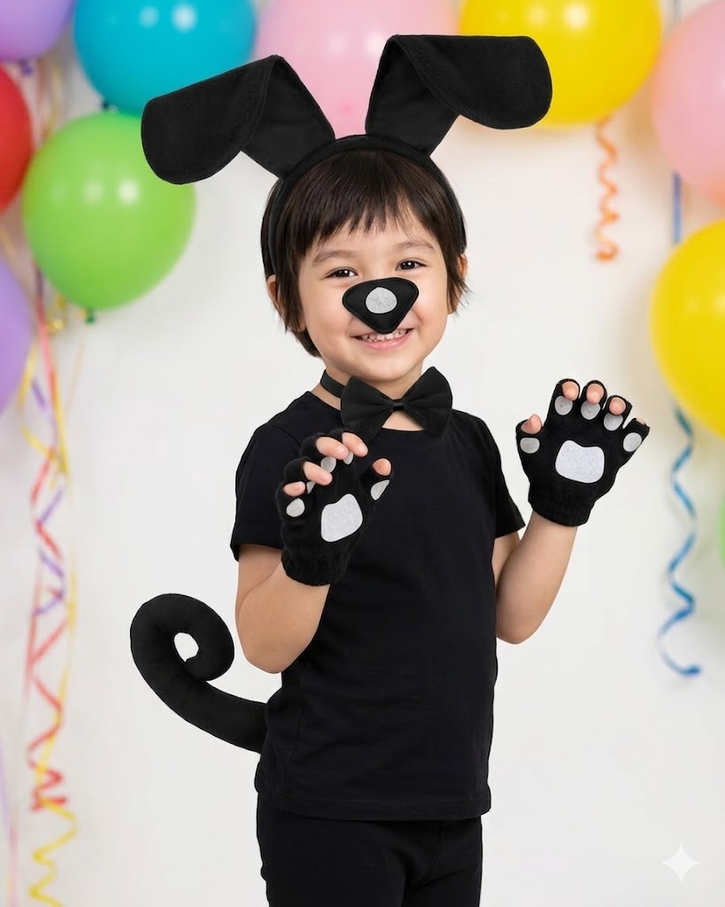 SET COMPLET DE ACCESORII – TRANSFORMARE RAPIDA: Pachetul include bentita cu urechi de caine, nas, papion. coada si manusi, oferind toate elementele necesare pentru un costum complet, fara a fi nevoie de alte piese vestimentare.