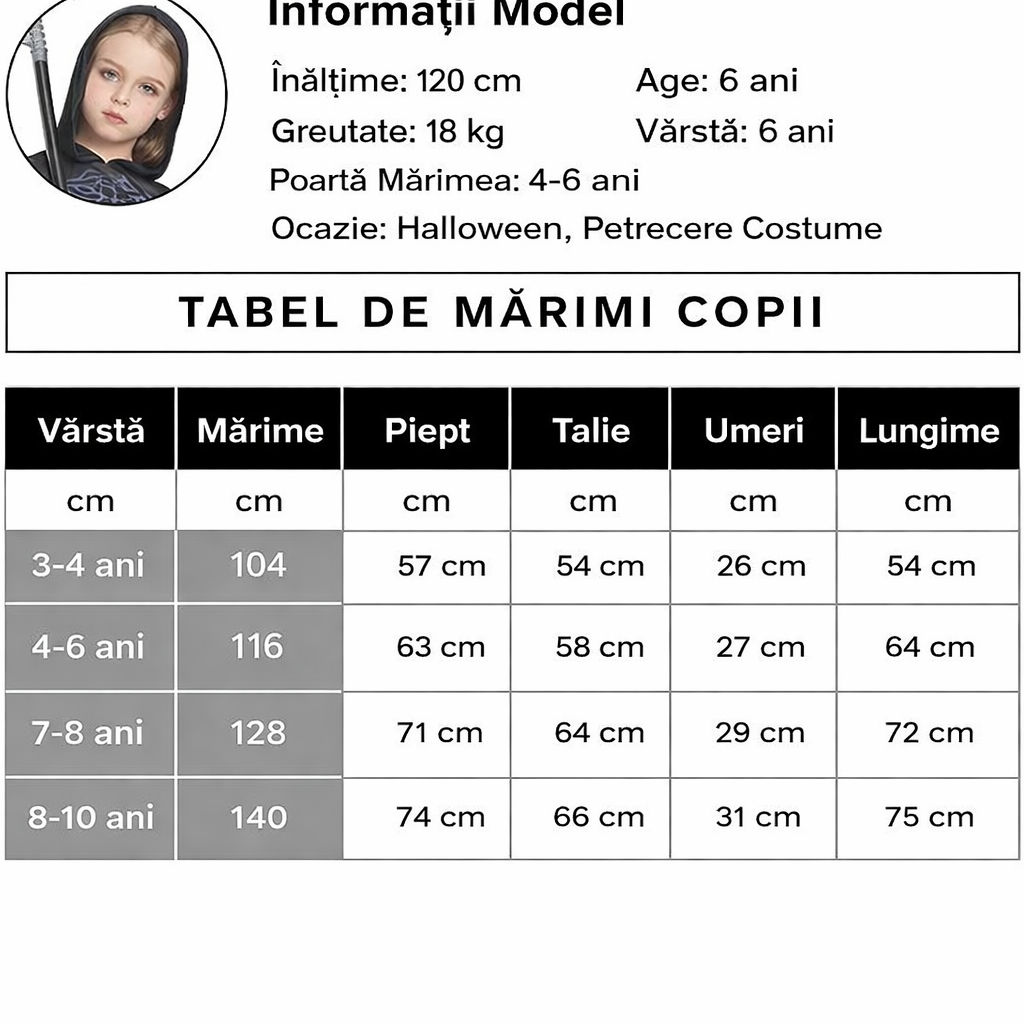 Costumul Grim Reaper pentru fete este alegerea potrivită pentru un look misterios și spectaculos de Halloween. Inspirat din personajul clasic al Morții, setul include rochie cu imprimeu schelet în degrade, glugă pentru un efect dramatic și accesorii care completează perfect ținuta.