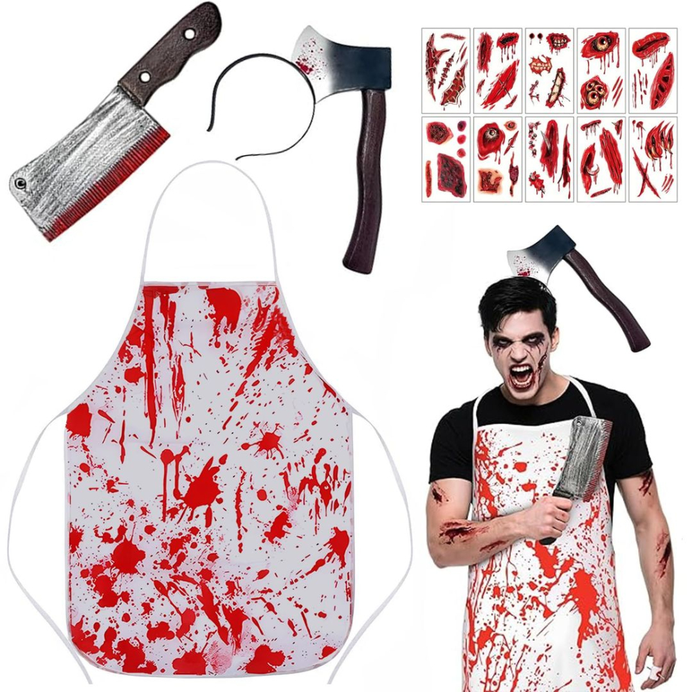 Costum macelar Halloween unisex, set de 4 piese cu sort insangerat, barda, satar si tatuaje temporare cicatrici. Perfect pentru petreceri horror si cosplay.