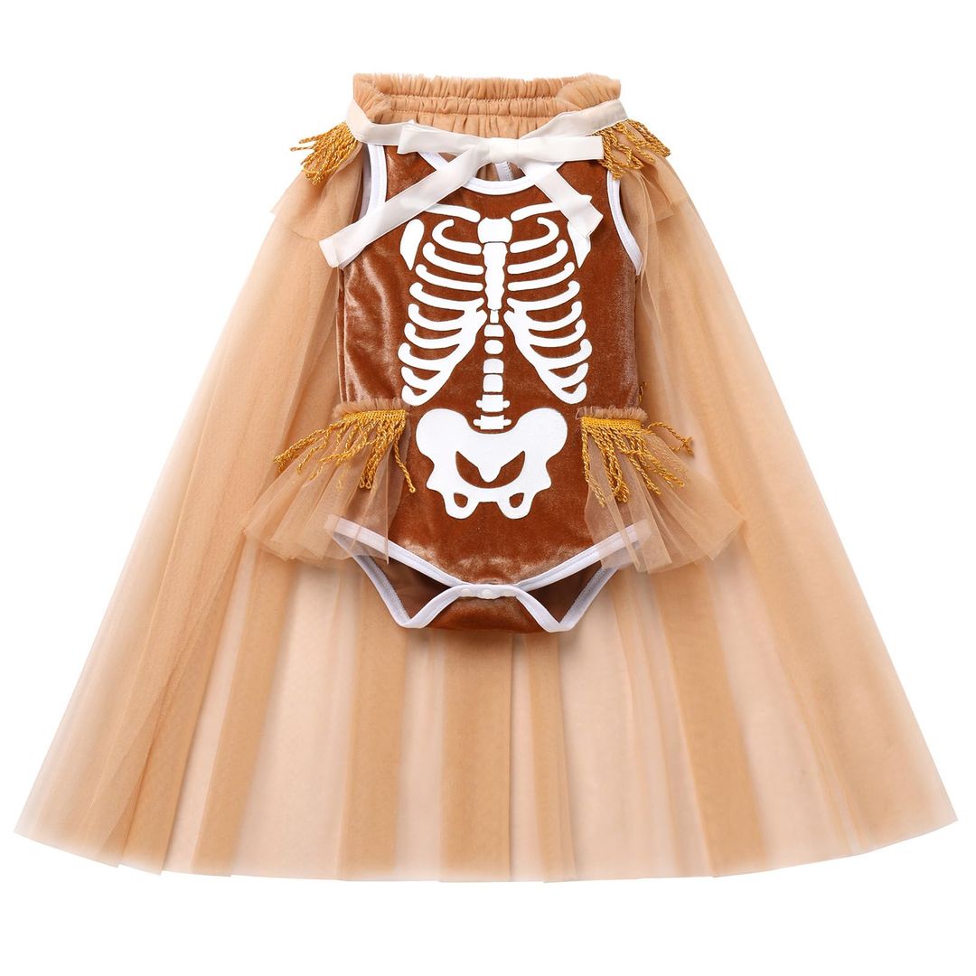 Costum schelet pentru fetite 3-4 ani cu capa vaporoasa din tulle. Confortabil, usor de imbracat si ideal pentru Halloween, carnaval si petreceri tematice.