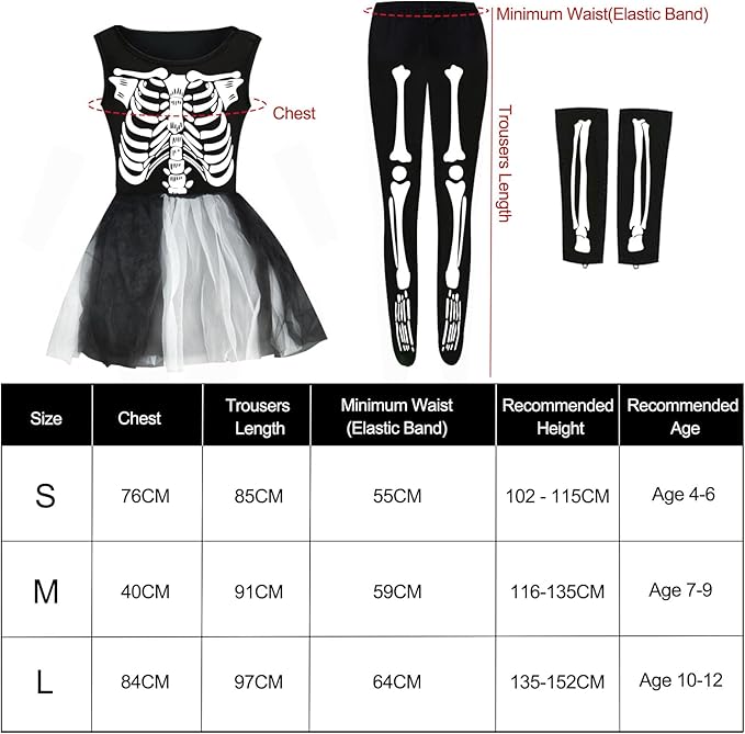 Costumul include tot ce îi trebuie unei apariții impresionante: rochiță tutu elegantă, colanți cu schelet imprimat, manșete elastice și coasă tematică din material ușor și sigur.