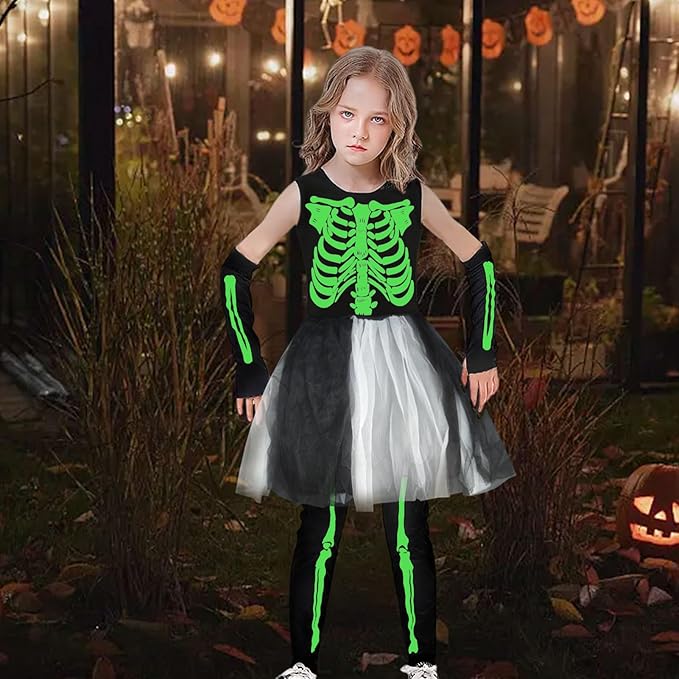 Costum Schelet Fosforescent pentru Fete M (7–9 ani) – Set Halloween Grim Reaper cu Rochiță Tutu, Colanți, Manșete și Coasă Glow in the Dark