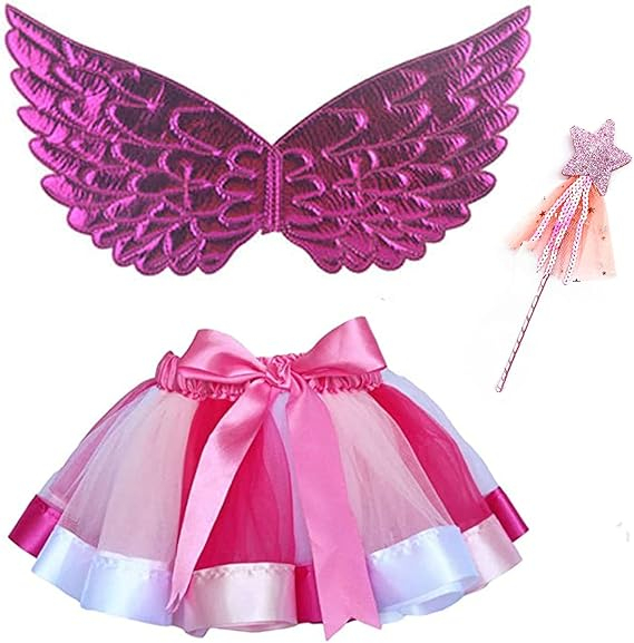 Acest costum fluture pentru fete îmbină aripi roz metalizat cu efect strălucitor și o fustă tutu în nuanțe de roz și alb, decorată cu fundă satinată frontală. Ținuta este echilibrată, feminină și potrivită pentru evenimente unde copilul tău trebuie să iasă în evidență într-un mod delicat și armonios.