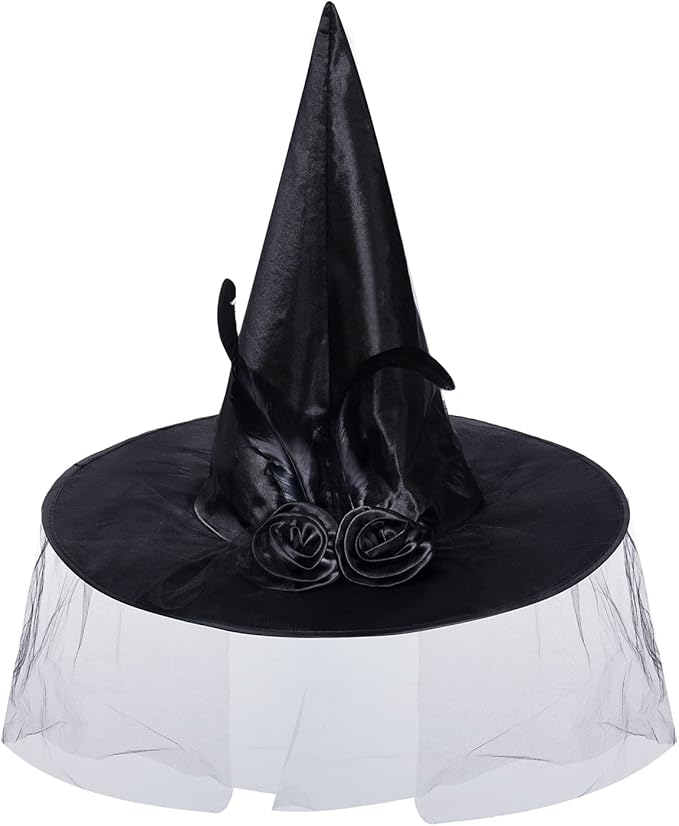 Vrei sa apari cu adevarat misterioasa la Halloween? Palaria de vrajitoare cu voal din tulle transforma instant orice costum intr-o aparitie eleganta si dramatica. Cu design bogat decorat si dimensiune impresionanta, este accesoriul perfect pentru petreceri tematice, cosplay sau sedinte foto.