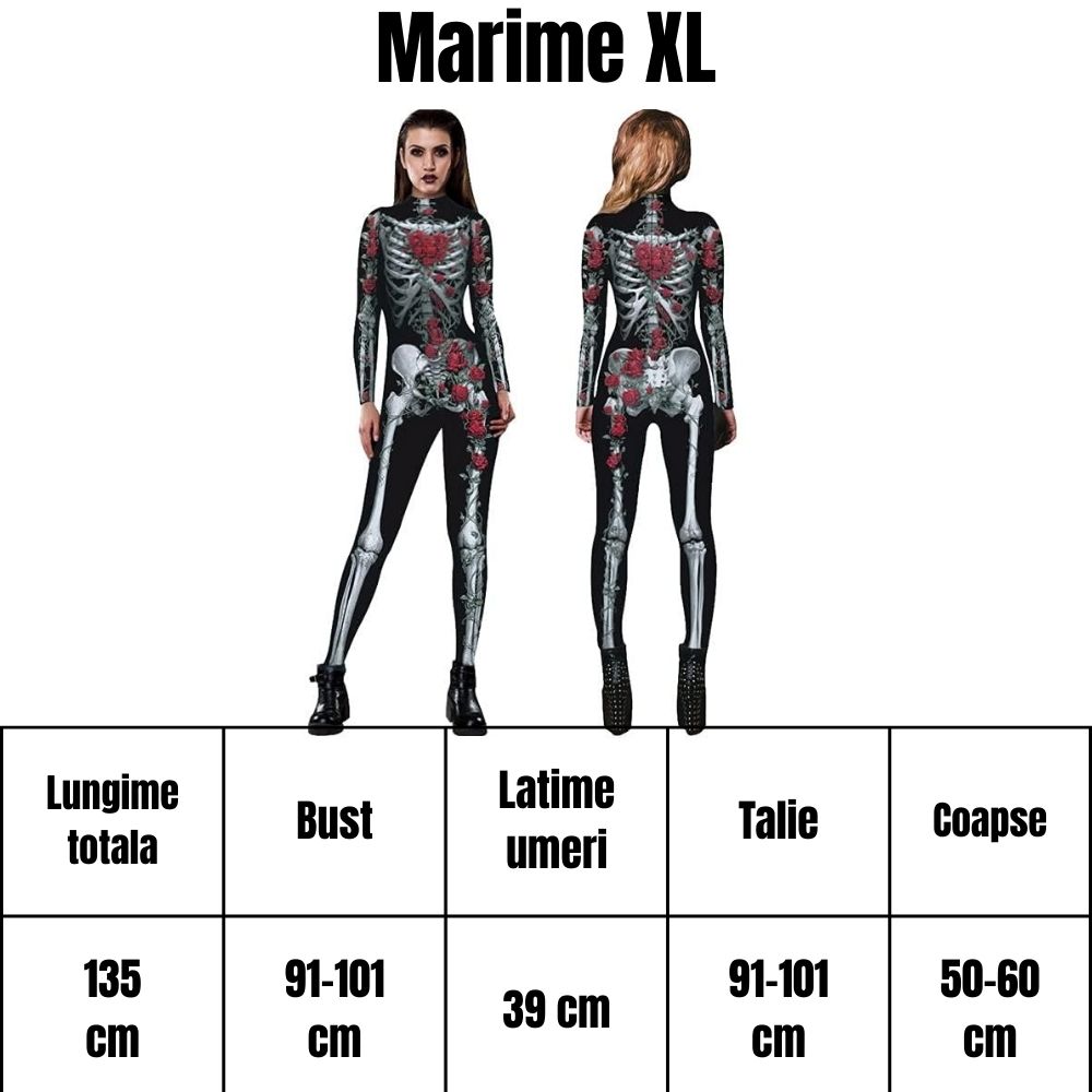 Salopeta Halloween cu schelet si trandafiri, marimea XL, este un costum spectaculos, ideal pentru petreceri tematice, Halloween, carnaval sau evenimente cosplay. Designul are un print realist cu efect 3D, care creeaza iluzia unui schelet detaliat, decorat cu trandafiri, oferind un aspect dramatic si atragator.