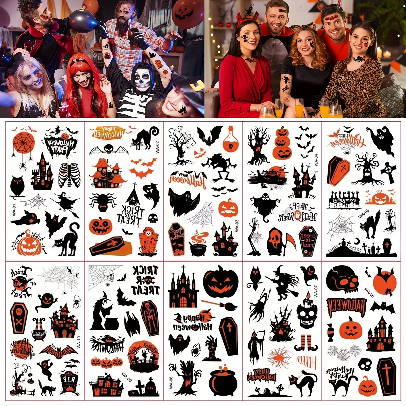 Set 10 foi tatuaje temporare Halloween, 10–12 modele pe foaie, activare cu apa, ideale pentru costume, petreceri si evenimente tematice.