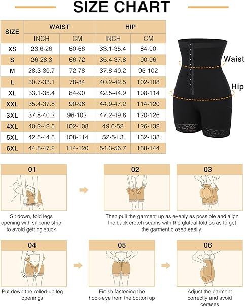 - Consultați Tabelul de Mărimi: Vă rugăm să măsurați circumferința taliei (1 inch deasupra buricului) și a șoldurilor, apoi consultați tabelul de mărimi din galerie pentru a alege mărimea potrivită. Este normal să fie dificil de îmbrăcat la început; încercați de mai multe ori pentru a obține rezultatul dorit.