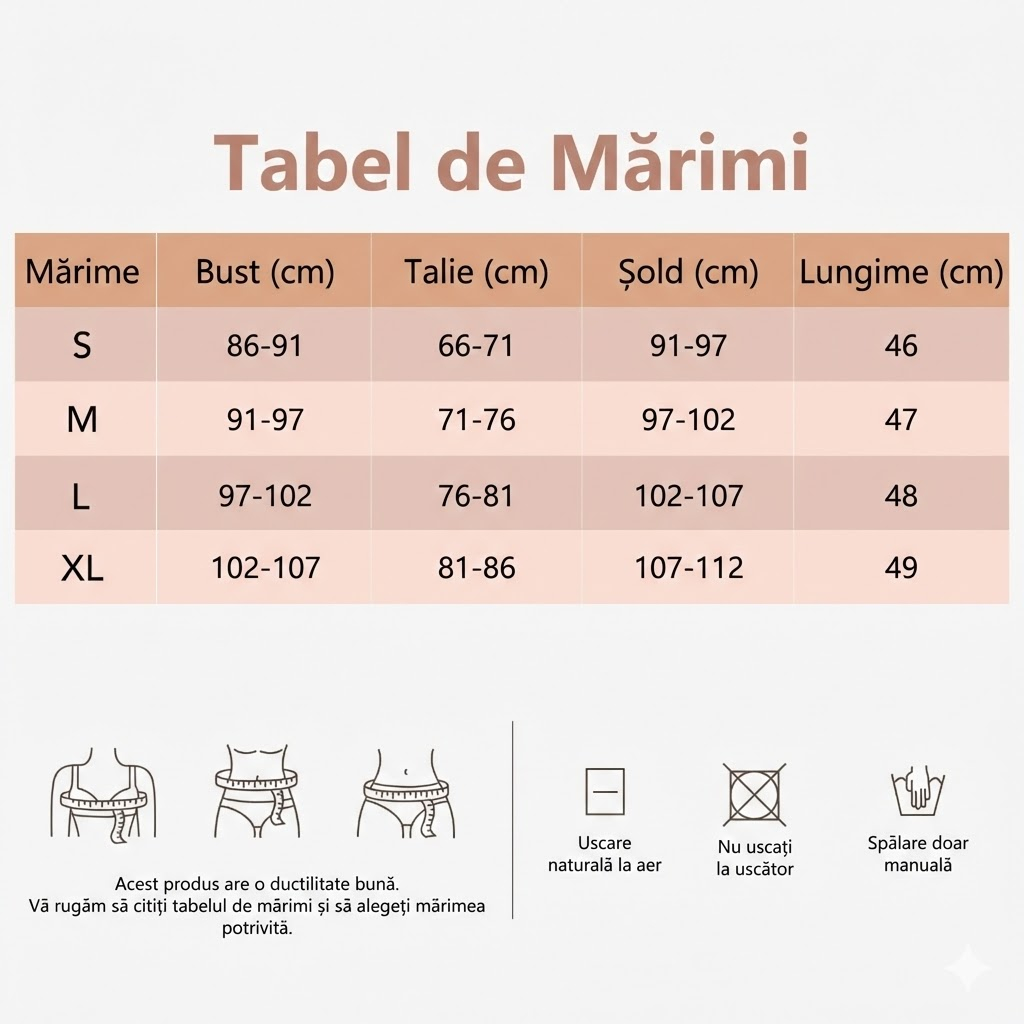 Designul clasic tip slip, împreună cu bretelele subțiri reglabile, asigură susținere și stabilitate pe tot parcursul purtării.