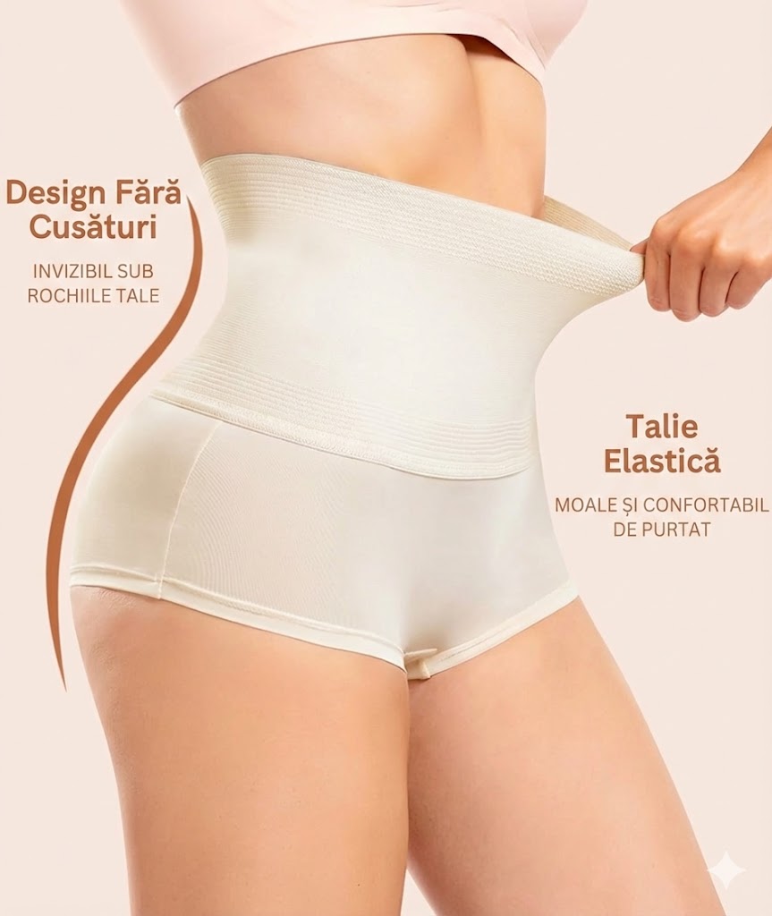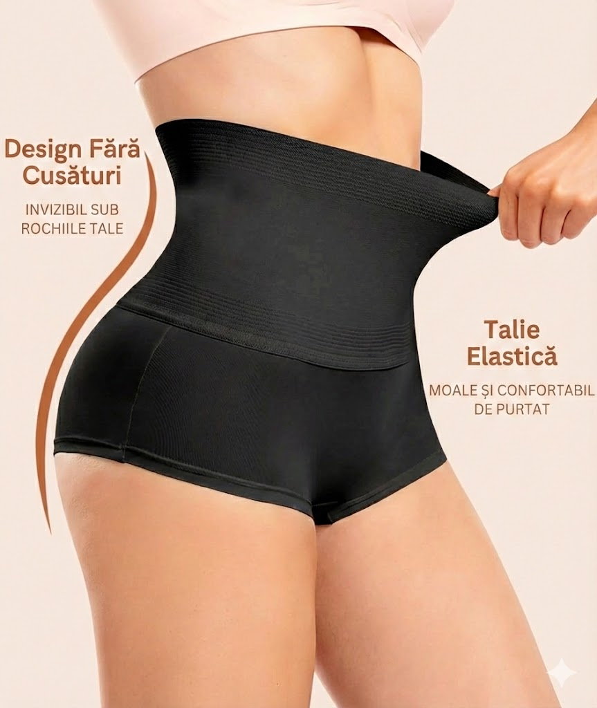 Compresie moderată, distribuită uniform, pentru netezirea burții și subțierea taliei, fără senzație de strângere.
