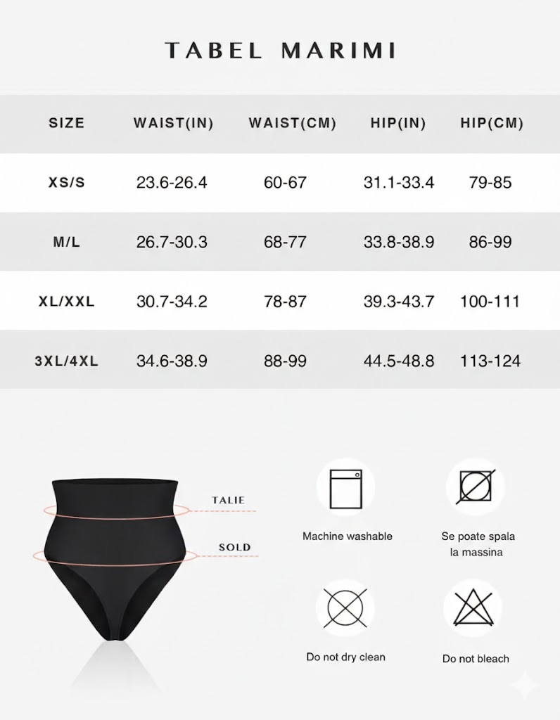Sfat: dacă ești între mărimi și vrei efect mai sculptat, alege mărimea ta exactă; pentru confort maxim, rămâi tot la mărimea ta (nu recomand să cobori o mărime).