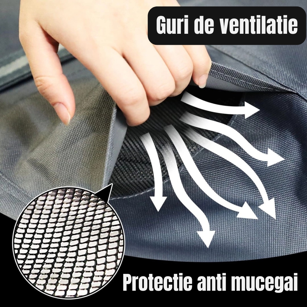 Stratul impermeabil previne infiltrarea apei, iar protectia anti-UV reduce decolorarea cauzata de expunerea indelungata la soare. Husa este ideala pentru mobilier de gradina, terasa sau balcon, fiind potrivita atat pentru utilizare pe timpul verii, cat si pentru depozitare in sezonul rece.