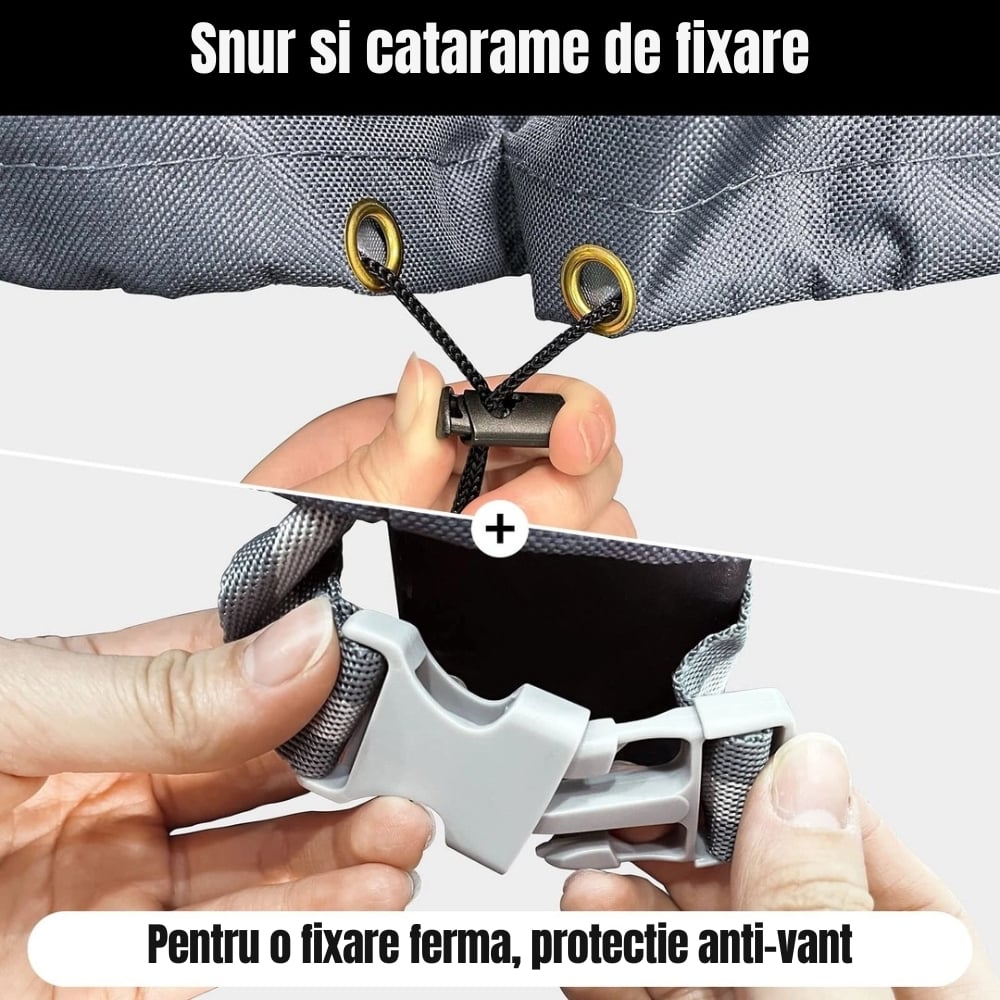 Culoarea gri antracit este moderna si discreta, integrandu-se usor in orice spatiu exterior. Husa se monteaza rapid si se curata usor cu o carpa umeda.