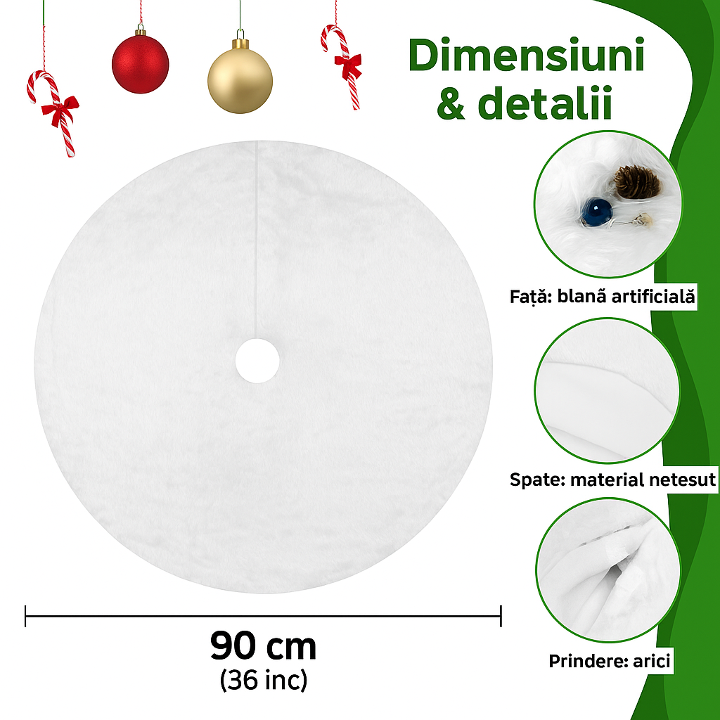Cu un diametru generos de 90 cm, acest covor este perfect dimensionat pentru a se potrivi majorității brazilor, ascunzând cu eleganță suportul metalic sau de plastic, inestetic. Astfel, întreaga atenție se va concentra pe frumusețea bradului și a ornamentelor alese.
