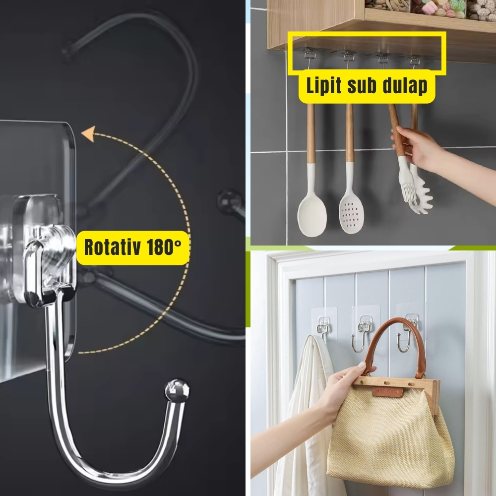 Materialul de calitate nu se deformeaza in timp, iar carligul permite agatarea sigura a prosoapelor, ustensilelor de bucatarie, halatelor, cheilor sau accesoriilor usoare.