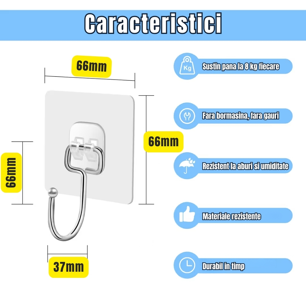ADEZIV PUTERNIC: Fiecare cuier este prevazut cu adeziv de inalta rezistenta, capabil sa sustina pana la 7 kg per bucata, oferind o fixare sigura.