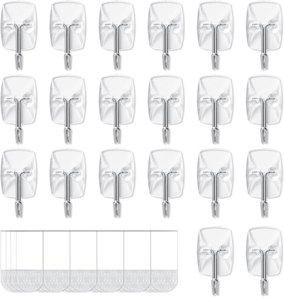 Set 20 carlige autoadezive transparente cu 24 benzi adezive, fara gauri in pereti, rezistente si discrete, ideale pentru organizare fara deteriorari.