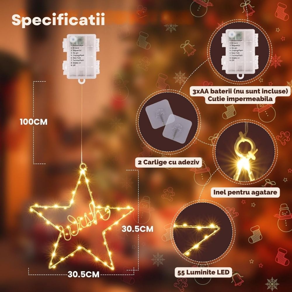 Acest set de 2 stele luminoase de Craciun cu 60 LED-uri este perfect pentru decorarea ferestrelor, peretilor sau a spatiilor exterioare in perioada sarbatorilor. Functioneaza cu baterii (nu necesita priza) si include 8 moduri de iluminare si functie de timer automat, oferind o lumina calda si festiva.