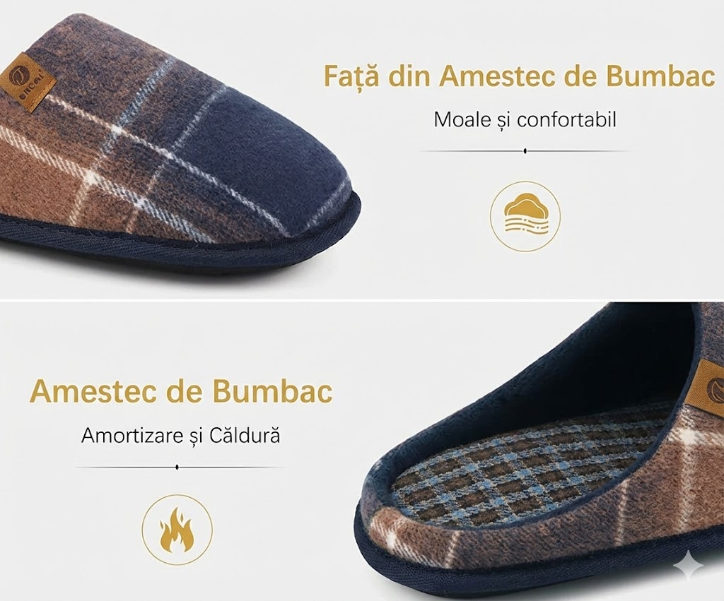 Bucură-te de o combinație perfectă între stil și funcționalitate cu acești papuci de casă ortopedici marca ONCAI. Modelul clasic în carouri (tartan), care îmbină nuanțe de maro cu accente de albastru (Fade Blue), aduce un plus de eleganță ținutelor de casă. Concepuți special pentru a oferi suport, acești papuci dispun de o structură ergonomică ce susține arcada piciorului, fiind ideali pentru relaxare după o zi lungă. Interiorul căptușit menține temperatura optimă, iar talpa robustă îți permite să te miști liber atât în interior, cât și în exterior.