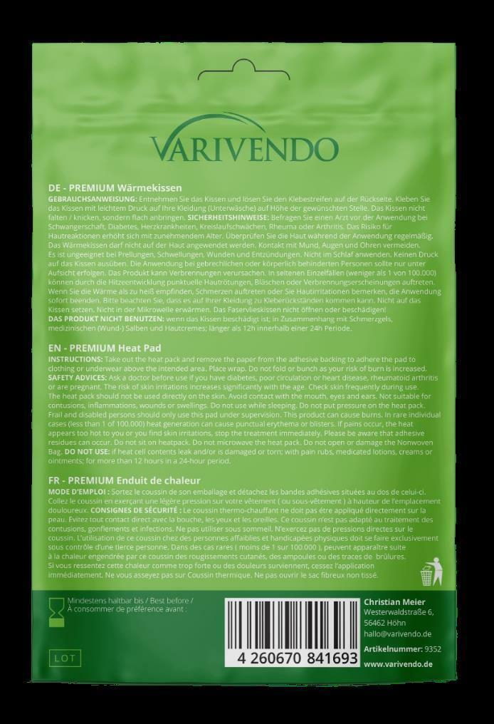 Consultați un medic inainte de utilizare dacă sunteți gravidă, aveți diabet, boli de inimă, circulație proastă, reumatism sau artrită. Riscul de reacții cutanate crește odată cu varsta. Verificați pielea in mod regulat in timpul utilizării. Padul termic nu trebuie folosit pe piele. Evitați contactul cu gura, ochii și urechile. Este nepotrivit pentru vanătăi, umflături, răni și inflamații. Nu utilizați in timp ce dormiți. Nu pune presiune pe pernă. Utilizarea la persoane fragile sau cu dificultăți fizice trebuie făcută numai sub supraveghere. Produsul poate provoca arsuri. In cazuri individuale rare (mai puțin de 1 din 100.000) dezvoltarea căldurii poate provoca inroșirea locală a pielii, vezicule sau arsuri. Dacă simțiți că căldura este prea fierbinte, simțiți durere sau observați iritații ale pielii, opriți-l imediat. Vă rugăm să rețineți că pot exista reziduuri de adeziv pe hainele dvs. Nu sta pe pernă. Nu incălziți in cuptorul cu microunde. Nu deschideți și nu deteriorați perna din fibră fleece! Nu utilizați produsul: dacă perna este deteriorată; in legătură cu geluri pentru durere, unguente medicinale (pentru răni) și creme pentru piele; mai mult de 8 ore intr-o perioadă de 24 de ore