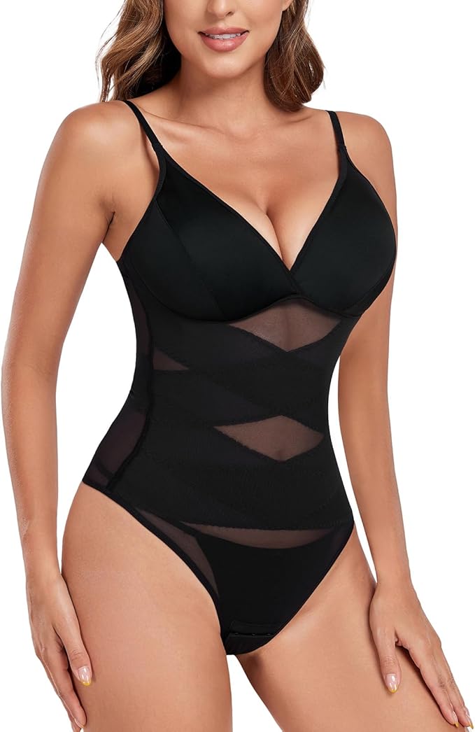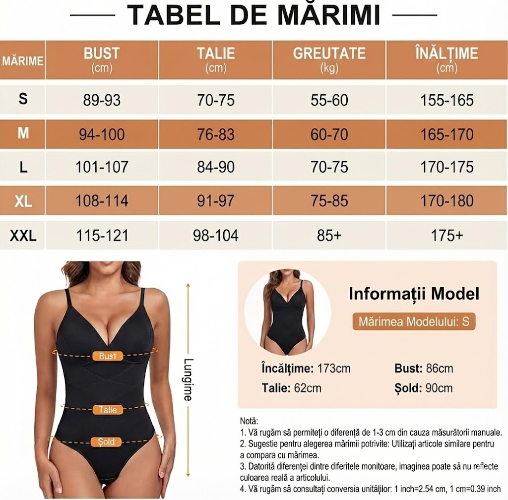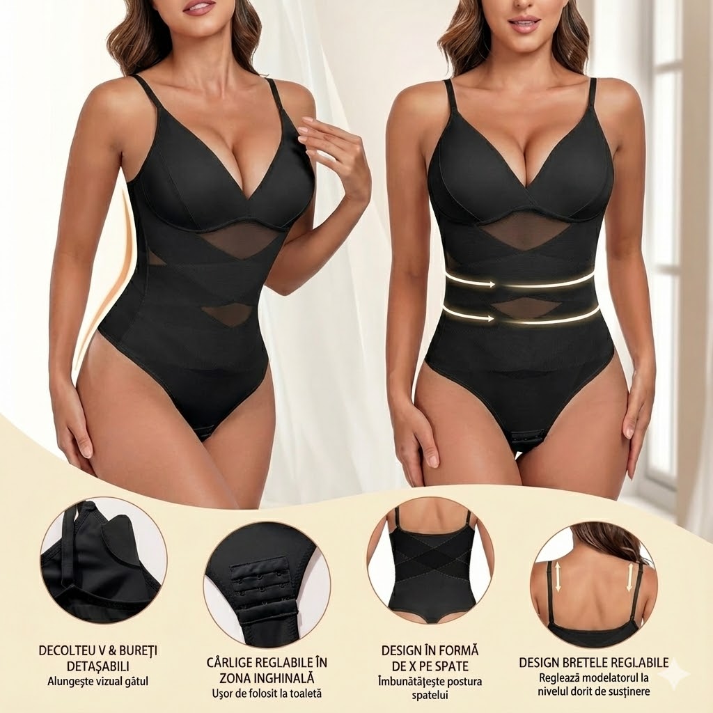 Body modelator de damă culoare Bej nude sau Negru, cu control ferm al abdomenului și spatelui, design elegant cu decolteu V, bustieră integrată și efect de subțiere vizibilă a taliei, ideal sub haine sau purtat ca top