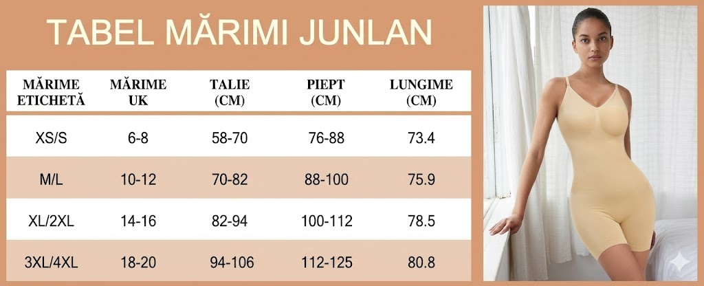 Obține o siluetă armonioasă și bine definită cu body-ul shapewear Junlan, creat pentru modelare completă și confort real. Conceput ca un produs general (culoare neagră), acest body este ideal pentru a fi organizat ulterior pe familii de mărimi.