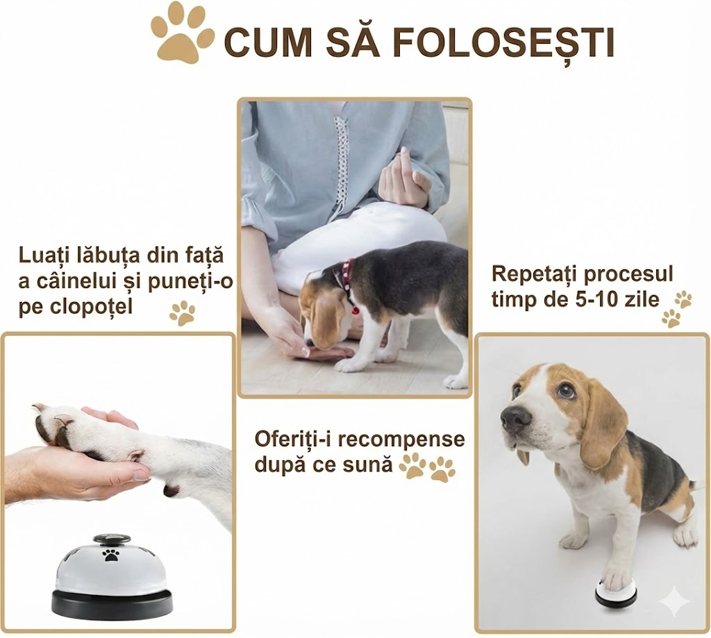 2️⃣ Ghidează lăbuța câinelui spre clopoței și lasă-l să sune.