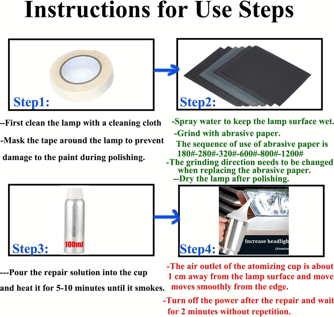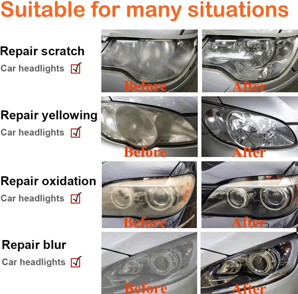 - Soluție completă: Nu sunt necesare achiziții suplimentare! Kitul include 100ml de soluție specială de recondiționare ce poate rezolva eficient îngălbenirea, înneburosirea, zgârieturile ușoare, oxidarea și pierderea luminozității farurilor.
