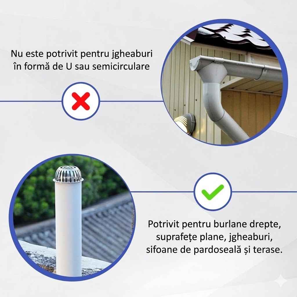 ⚠️ Nu este potrivit pentru jgheaburi în formă de U sau semicirculare.