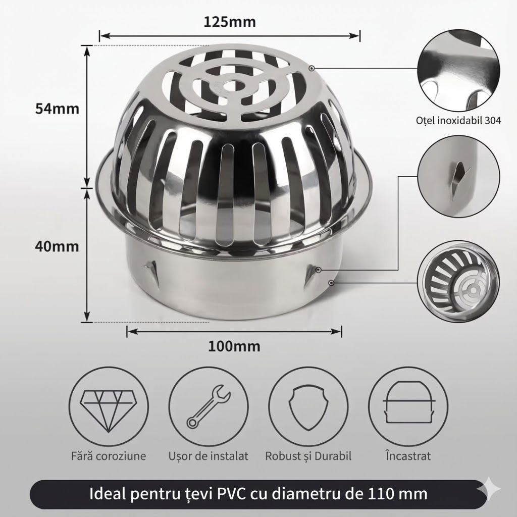 Designul tip grilaj permite scurgerea liberă a apei, în timp ce oprește impuritățile să pătrundă în conductă. Instalarea este extrem de simplă: apărătoarea se introduce direct în burlan, fără unelte sau asamblare suplimentară.